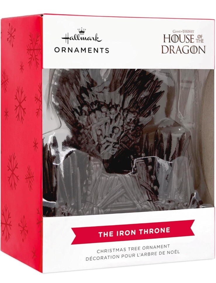 - ADDITIONAL INFO: THIS ORNAMENT FEATURES THE ICONIC IRON THRONE FROM THE HIT TV SHOW GAME OF THRONES. CRAFTED FROM DURABLE IRON, THIS ORNAMENT MAKES A DRAMATIC DISPLAY IN YOUR CHRISTMAS TREE. IT'S PART OF THE GAME OF THRONES COLLECTION AND OFFICIALLY LICENSED BY HBO/HOME BOX OFFICE.