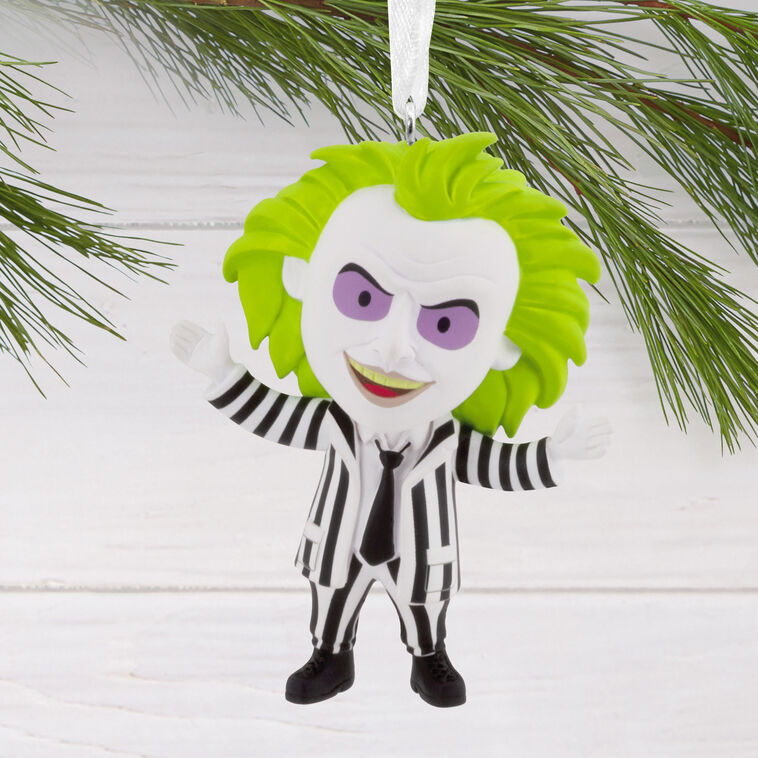 • ADDITIONAL INFO: RESIN ORNAMENT WITH HANGER ATTACHMENT. COUNT: ONE HALLMARK CHRISTMAS ORNAMENT. ITEM NUMBER: 3HCM3252. DIMENSIONS: 2.5 X 3 X 1.75. MATERIAL: RESIN ORNAMENT WITH HANGER ATTACHMENT. FEATURES BEETLEJUICE IN HIS BLACK-AND-WHITE STRIPED SUIT AND NEON GREEN HAIR